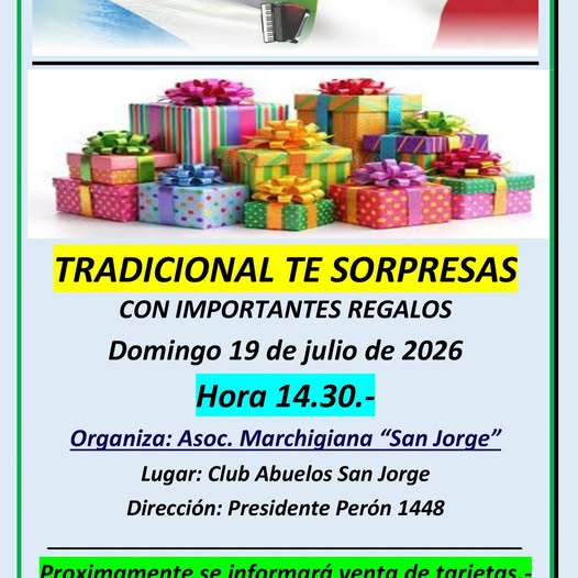 ANUNCIAN TE BINGO de la Asoc. Marchigiana InicioNoticias 23 de abril de 2026 FacebookXWhatsAppEmail La Asociación Marchigiana de San Jorge anuncio la realizacion de su tradicional Te Bingo para el 19 de JUlio pmo. EXITOSA JORNADA FESTEJOS PATRONALES 23 de abril de 2026 Nacionales: El Gobierno niega el ingreso de los periodistas acreditados en Casa Rosada 23 de abril de 2026 PROCESION POR EL SANTO PATRONO 23 de abril de 2026 EL CENTRO COMERCIAL SALUDA EN EL DIA DE LOS FESTEJOS PATRONALES 23 de abril de 2026