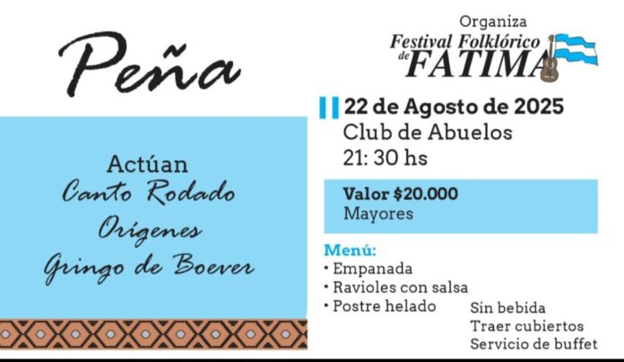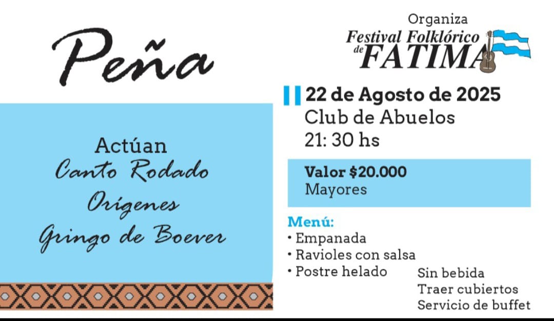 El viernes 22 de agosto, la Asociacion del Barrio Fatima organiza una peña folklorica en el club deAbuelos de San jorge. Actuarán –Canto Rodado-, -Orígenes- y el humor del -Gringo de Boever-.